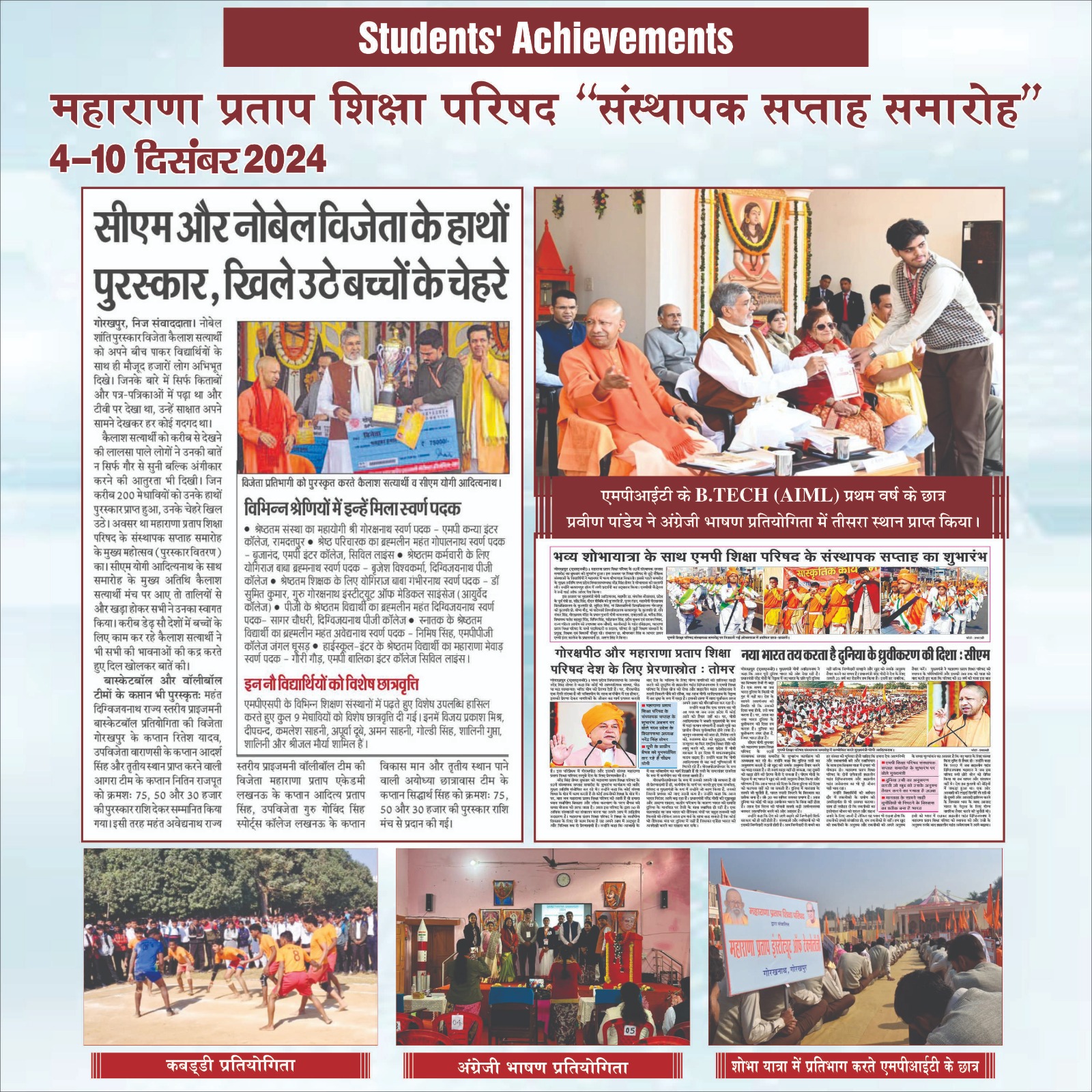 MPIT student felicitated by Honorable CM, and Noble Laureate Sh. Kailash Satyarthi